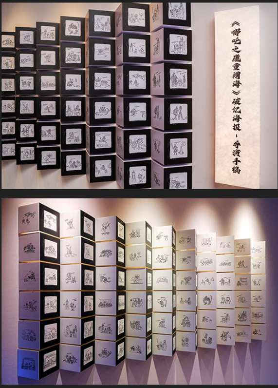 本区域主要展示10余个电影里重要角色的手稿、迭代图,以及电影中多个高能场景的美术创作画面。比如哪吒从最初到现在的整个迭代历程,太乙真人的七色宝莲的多个未被采用的设计版本,还有石矶娘娘妆容的细节调整等。每一张手稿都透露出创作者如何在传统神话与现代审美间找到平衡,赋予了角色鲜活的生命力。