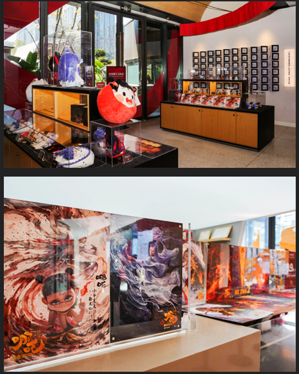 IP衍生品展示区,该区域主要展示了电影哪吒系列的相关IP衍生品,这里既有主题人物的手办、绘本,也有明信片,毛绒玩偶、杯子、徽章等周边文创产品,这些产品也受到了广大影迷的喜爱,许多产品甚至供不应求。